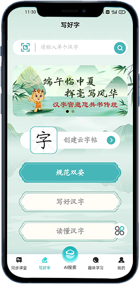 汉字宫A是家庭实⽤的⼿机APP,帮助家⻓在家辅导孩⼦作业,协助孩⼦听写作业,打印字帖练字。